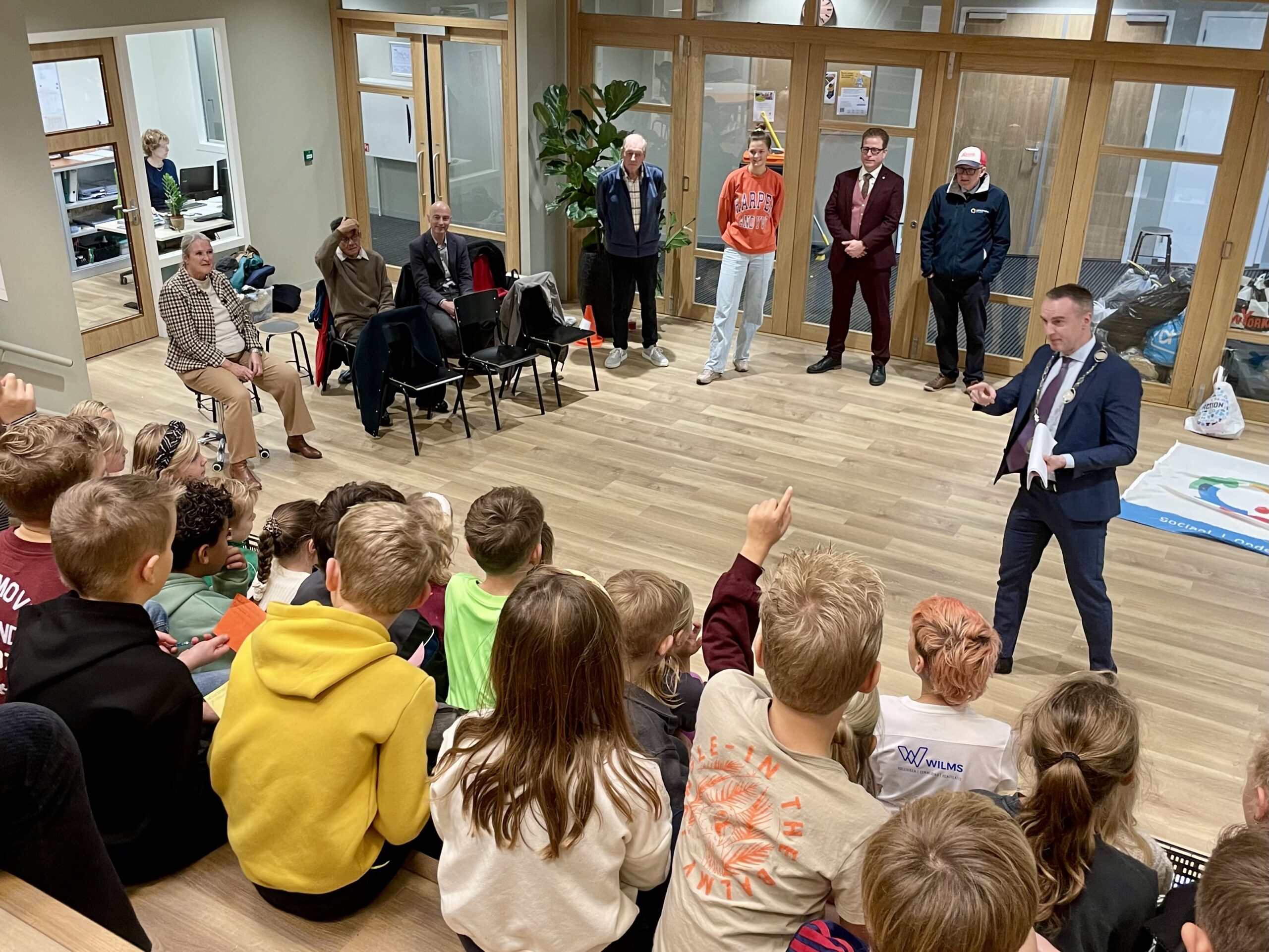 HOOGWOUD – Maandag 3 november was een bijzondere dag voor de leerlingen van basisschool St. Wulfram in Hoogwoud. De school kreeg hoog bezoek van burgemeester Herman Wiersema, wethouders Robert Tesselaar en Vincent Buis, gemeentesecretaris Belinda Goransson en vier raadsleden van de gemeente Opmeer. Het bezoek stond in het teken van het schoolthema “Het bestuur van de gemeente”, dat momenteel wordt behandeld door de leerlingen van groep 4 en 5.