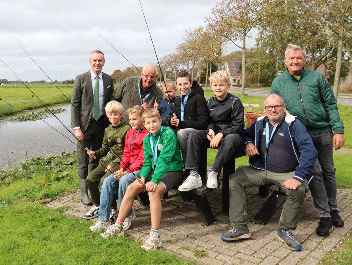 OPMEER – Waarnemend burgemeester Herman Wiersema ging dinsdag 7 oktober vissen bij de camperplaats bij ’t Kerkhuys in Spanbroek, samen met kinderburgemeester Duane van Dijk en zijn vriendjes: Daan Schenk, Hidde Groenewoud, Binc van der Ploeg en Siem Vlaar.